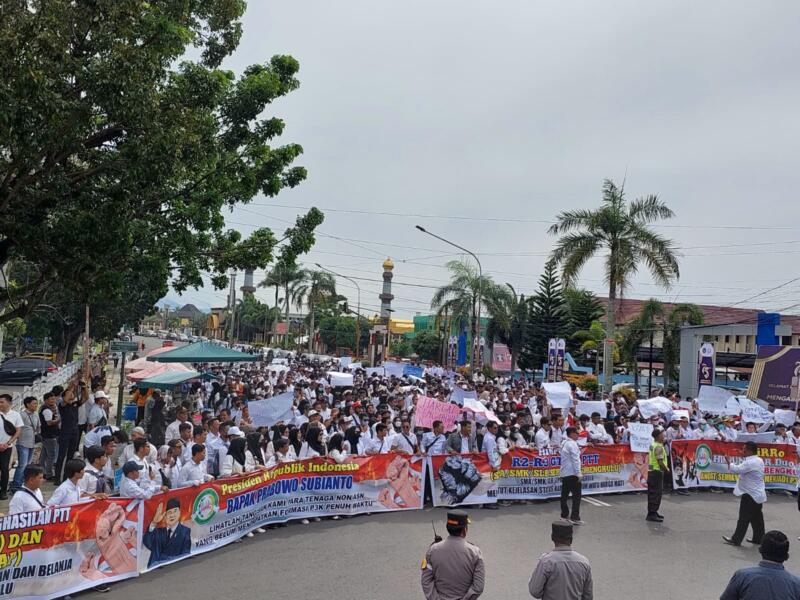 Benkulu,reformasinews.com – Sekitar seribuan lebih pegawai honorer yang datang dari seluruh kabupaten sse-Provinsi Bengkulu, demo di kantor Gubernur Bengkulu, pada pagi Rabu 15 Desember 2025.