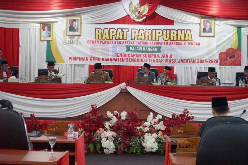Bengkulu,reformasinews.com- DPRD Kabupaten Bengkulu Tengah menggelar Rapat Paripurna dengan agenda Pengucapan Sumpah dan Janji Pimpinan DPRD Bengkulu Tengah periode 2024-2029 pada, Selasa 29 Oktober 2024.