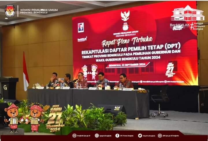 Bengkulu,reformasinews. com- Ketua KPU Provinsi Bengkulu Rusman Sudarsono bersama Anggota KPU Provinsi Bengkulu Alpin Samsen, Dodi Hendra Supiarso, Emex Verzoni dan Sarjan Efendi menggelar Rapat Pleno Terbuka Rekapitulasi Daftar Pemilih Tetap (DPT) Tingkat Provinsi Bengkulu, Pemilihan Gubernur dan Wakil Gubernur Bengkulu Tahun 2024, Minggu (22/9/2024) di Grage Hotel Bengkulu.