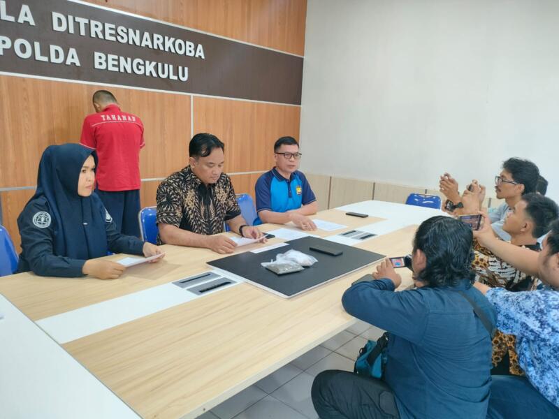 Ditresnarkoba menggelar konferensi pers yang dipimpin oleh Kabag Wasidik AKBP Joan Verdianto, SIK., M.TR.Opsla, didampingi oleh Paur Pensat Bidhumas Polda Bengkulu, Iptu Desty Sukarlia Sari.