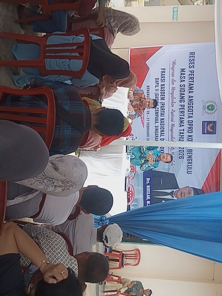 Bengkulu,reformasinews.com- Anggot DPRD Kota Bengkulu Fraksi Partai Nasdem, Drs Riuslan, MSi dari Dapil II Kecamatan Singaran Pati dan Gading Cempaka Kota Bengkulu, mengadakan pertemuan masa sidang reses perdana tahun 2026 di Kelurahan Sidomulyo Kota Bengkulu, Senin 16 Februari 2026.