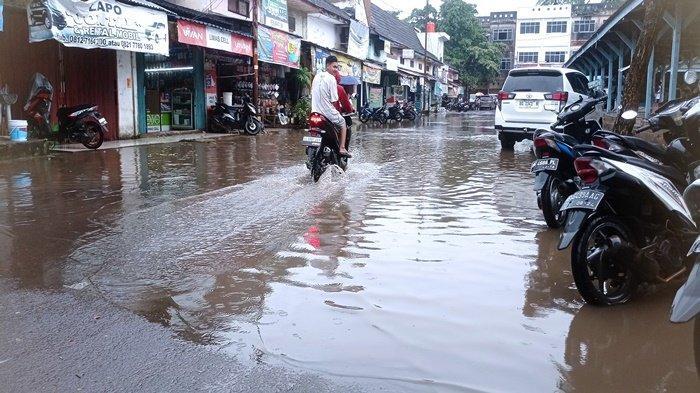Seperti di Suka Bangun hujan deras membuat ruas jalan utama di kawasan tersebut banjir hingga lebih dari setengah ban motor.