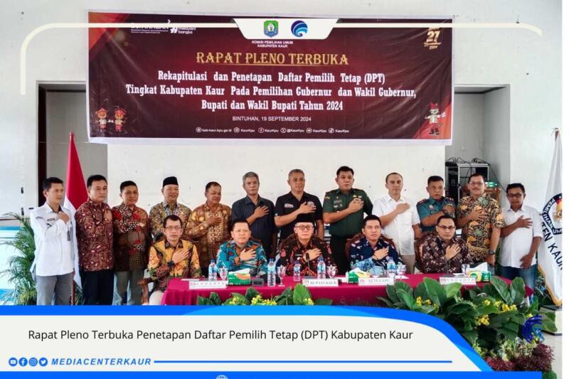 Kaur,reformasinews.com- – Komisi Pemilihan Umum Kabupaten Kaur menggelar acara Rapat Pleno Terbuka Rekapitulasi dan Penetapan Daftar Pemilih Tetap (DPT) Tingkat Kabupaten Kaur pada Pemilihan Gubernur dan Wakil Gubernur, Bupati dan Wakil Bupati Tahun 2024.