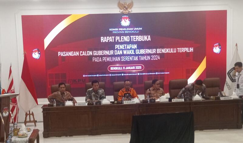 Penetapan pasangan gubernur dan wakil gubernur terpilih priode 2025-203, Helmi Hasan- Mian, pada rapat peleno yang dipimpin Ketuà KPU Provinsi Bengkulu Rusman Sudarsono di Aula Kantor KPU Jalan Kapuas Lingkar Barat Bengkulu, sore Kamis 9 Desember 2025.