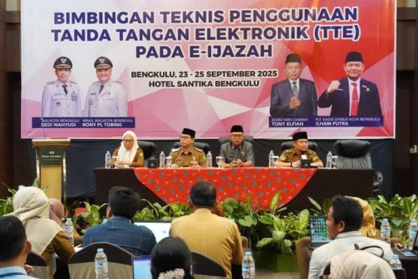 Bengkulu,reformasinews.com- Dalam rangka meningkatkan pemahaman dan pemanfaatan teknologi digital di Bidang Pendidikan, Pj Sekretaris Daerah Kota Bengkulu Tony Elfian membuka acara Bimbingan Teknis Penggunaan Tanda Tangan Elektronik (TTE) pada E-Ijazah Sekolah, di Hotel Santika Kota Bengkulu, Selasa (23/9). Sebagai informasi kegiatan ini dilaksanakan selama tiga hari mulai dari tanggal 23 hingga 25 September 2025.